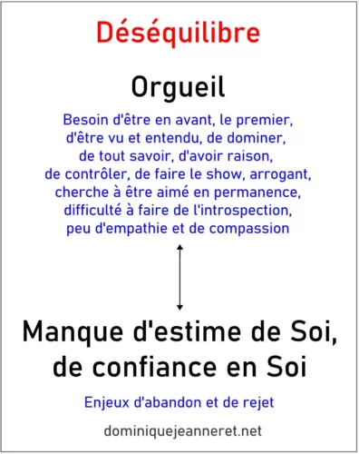 L’enjeu principal de l’orgueil, le manque de confiance en soi, reflète une perception négative de ses propres capacités. Cela peut être le résultat de critiques constantes, d’échecs répétés ou d’une comparaison constante avec les autres. Il découle de l’enjeu d’abandon / rejet.