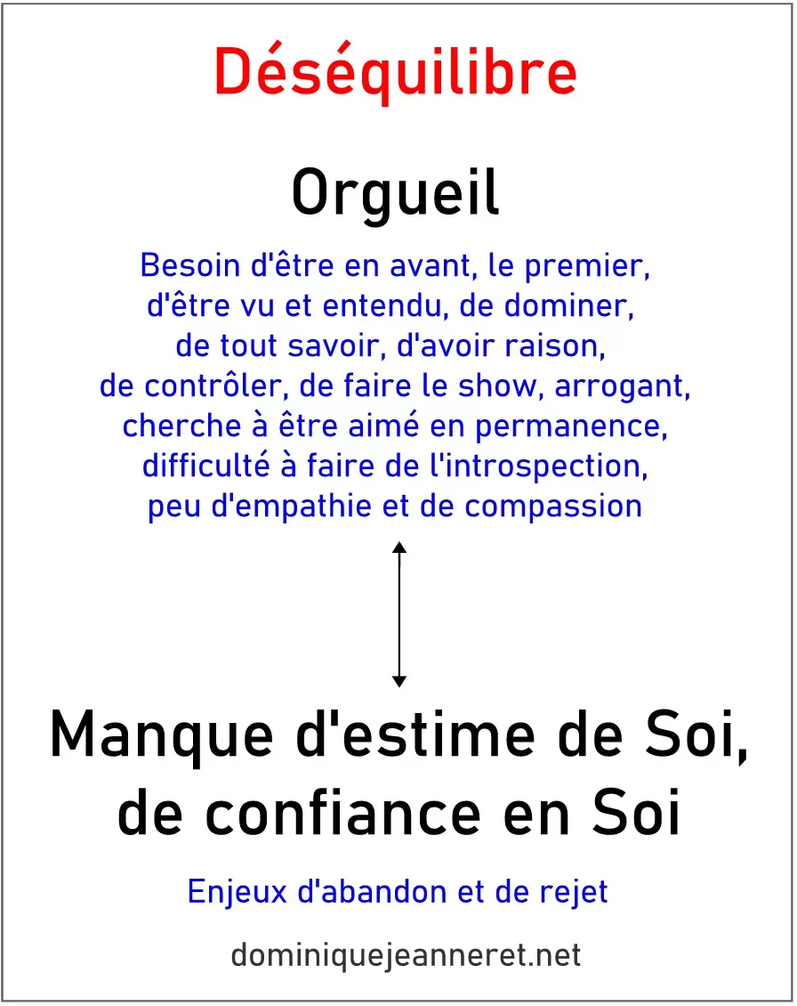 L’orgueil révèle un manque d’estime de soi, lequel est inversement proportionnel à l’orgueil. Plus la personne est orgueilleuse, moins elle a confiance en elle / d’estime d’elle-même.