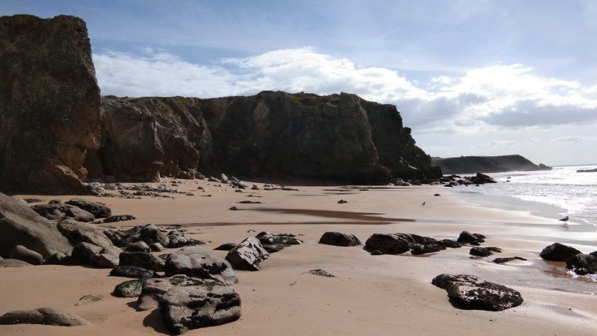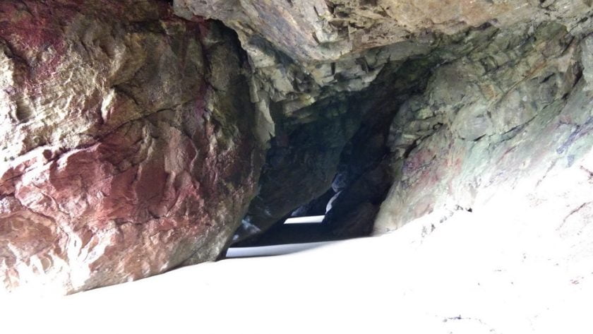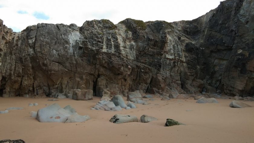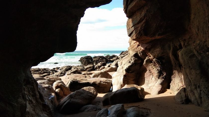 Nous avons marché à travers les rochers entourés de sable. Nous avons traversé des grottes à plafonds très hauts avant d’arriver à une plage puis une autre puis une autre et enfin une petite plage où mon amie s’est baignée dans une crique pendant que les surfers prenaient de hautes vagues au loin.