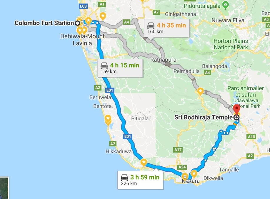 Je vous suggère donc plutôt de prendre un taxi qui vous amènera directement à votre logis. Aéroport-Colombo prend environ 1h-1h30 suivant le trafic. Pour prendre un taxi moins cher que les « officiels » de l’aéroport, téléchargez les applications PickMe Sri Lanka et Uber et faites une demande par une de ces compagnies. En général, il y en a toujours un à 5 minutes de l’aéroport près à venir vous chercher. Prix de la course, suivant si c’est le jour ou nuit : entre env. 2500 et 3500 LKR. Vérifiez que le chauffeur a bien enclenché le compteur en partant !